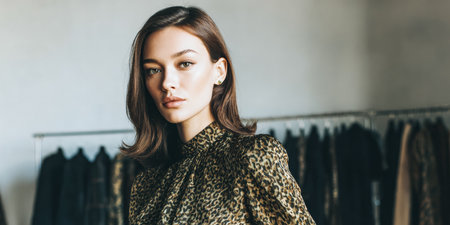 A model stands in a clothing store. She is wearing a patterned top and has a serious look. Rows of clothes hang behind her. Natural light fills the space.