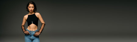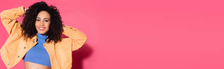 smiling african american woman in jacket and crop top posing on pink, banner