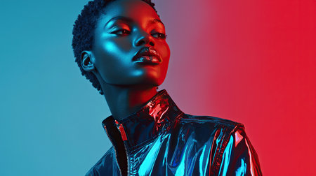 A captivating portrait of a confident young woman showcasing artistic apparel. The unique design and striking lighting create a powerful visual impact, embodying style and individuality.