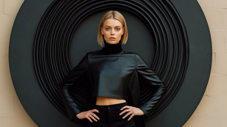 picture of a pretty young lady smiling and standing against a wall with a circle on it while wearing all black. GENERATE AI