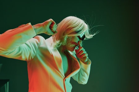 Stylish man in a white suit expressing emotions with vibrant lighting and a dramatic pose, showcasing creativity and individuality against a colorful backdrop