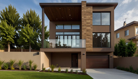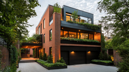 Modern brick house with greenery and large windows in urban setting.