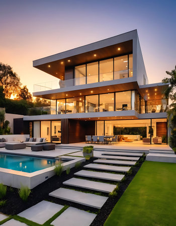 Luxury modern house with swimming pool at sunset. Nobody inside