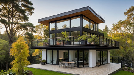 A contemporary two-story house featuring expansive glass windows, a spacious patio with outdoor furniture, and lush green surroundings, providing a serene and luxurious living experience. AI generated image