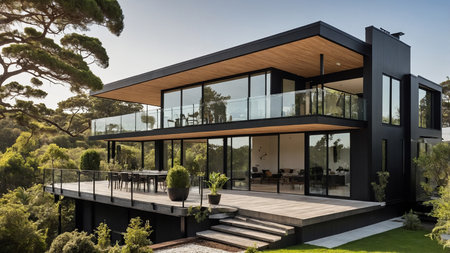 A contemporary two-story house featuring extensive glass windows, a large wrap-around wooden deck, and lush surrounding greenery, captured during the day in a serene natural setting. AI generated image