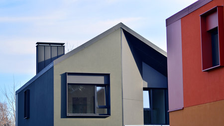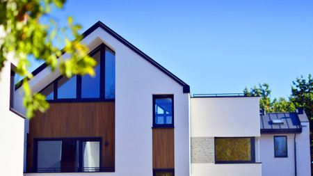 Terraced single family homes in newly developed housing estate. The real estate market in the suburbs with lush greenery surrounding. Harmony with nature, eco architecture.