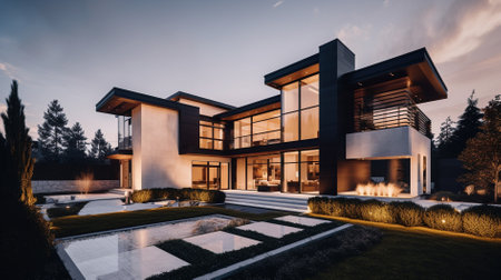 This image features a contemporary single-story home with a white exterior, dark roof, and well-manicured landscape, showcasing a lush green lawn and ornamental plants in the front yard with stone walkways. AI generated image
