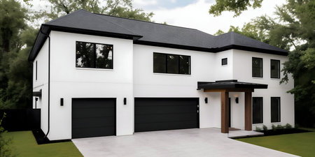 A modern suburban house features a two-car garage, stone trim, and a minimalistic landscaped front yard. The driveway is clean and wide under a clear blue sky.