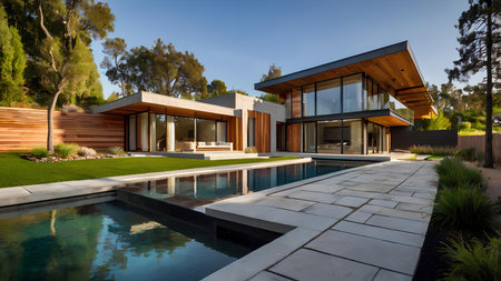 This image captures a modern luxury house with a spacious green garden and a sleek swimming pool, reflecting minimalist architectural design and serene setting, perfect for a sophisticated lifestyle and outdoor relaxation.