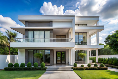 Modern home with a clean and contemporary design. It features a flat roof, large windows, and a minimalist color palette