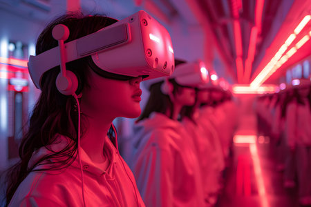 Diverse group wearing VR headsets engaged in virtual collaboration in a neon-lit environment. Great for metaverse, tech, and remote work themes.