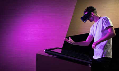 Young man interacting in a digital world, using virtual reality headset with motion tracking tech, making hand gestures in the air.