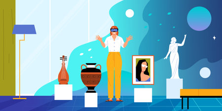 woman wear digital glasses virtual reality art gallery museum interior creative contemporary paintings artworks or exhibits vr headset technology concept flat copy space vector illustration