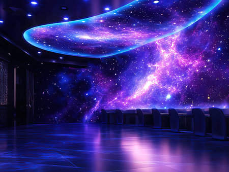 A person experiences virtual reality with vibrant colors and dynamic lights in a modern setting.