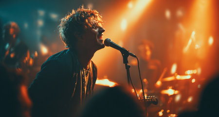 Young male singer is passionately playing electric guitar and singing into microphone on stage during a concert, illuminated by warm orange stage lights, creating an immersive musical experience