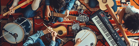 Top view of a folk music concert with acoustic instruments and a relaxed audience. -