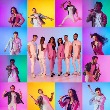 Collage of portraits of young emotional talented musicians on multicolored background in neon light. Concept of human emotions, facial expression, sales. Playing guitar, saxophone, singing, dancing.