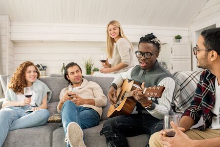 Friends with glasses of wine listening to African guy playing guitar and singing