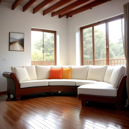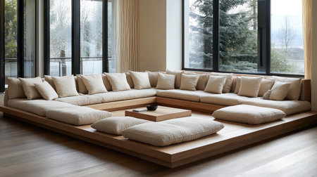 Bright and inviting living room featuring a spacious, modern seating arrangement with plush cushions, natural light streaming through large windows, and a serene aesthetic perfect for relaxation.