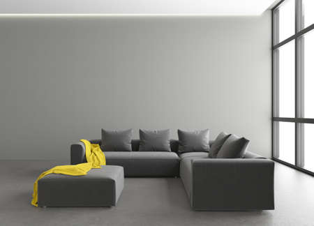 Interior of modern living room with grey walls, concrete floor, comfortable sofa and coffee table. 3d rendering