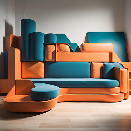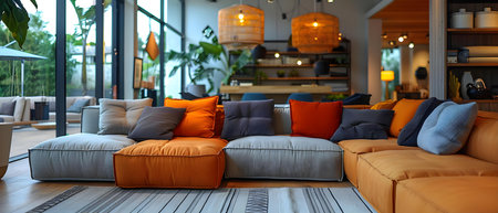 Interior of a modern living room with orange and blue sofas