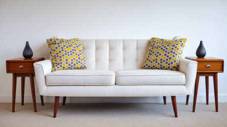 A cream-colored sofa sits between two wooden side tables in front of a plain white wall. The sofa is adorned with patterned cushions, adding a pop of color to the scene. The lighting appears soft and even, highlighting the furniture's texture and form. This image could be suitable for interior design projects and lifestyle content.