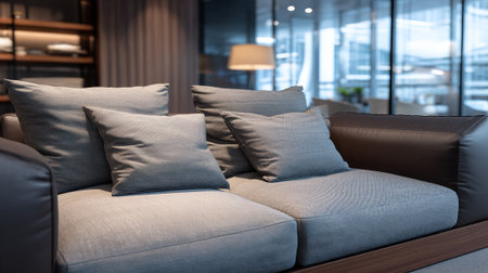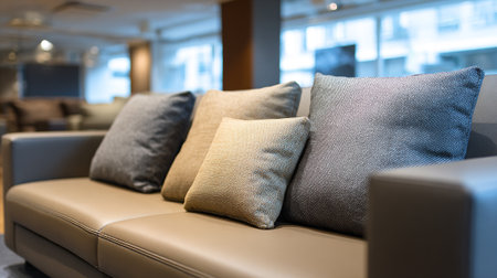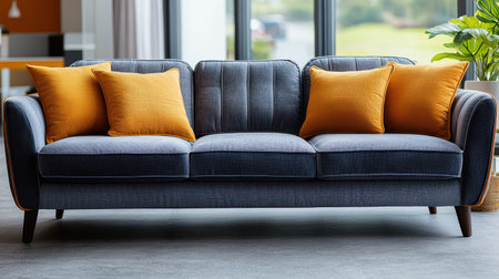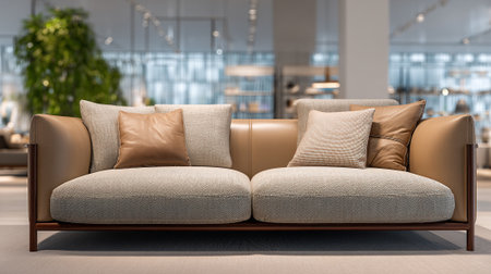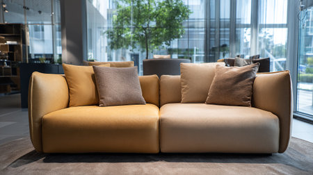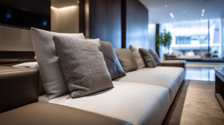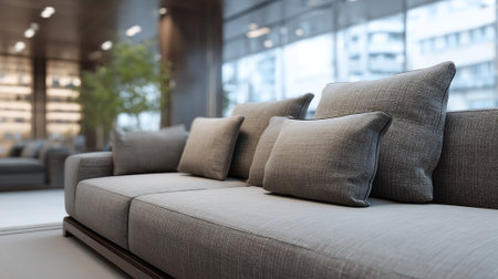A modern sofa with pillows in a stylish living room with a plant in the background