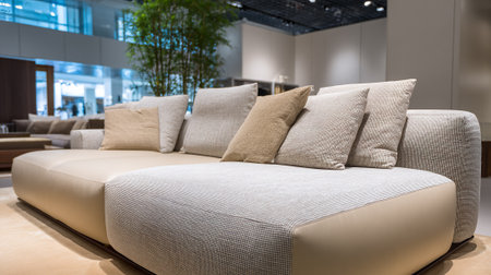 A modern beige sectional sofa with throw pillows in a stylish furniture store showroom