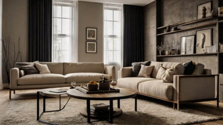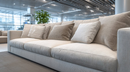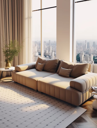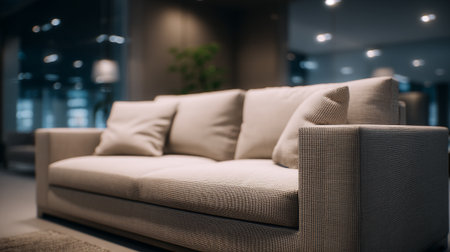 A modern beige sofa in a stylish living room with soft lighting and blurred background