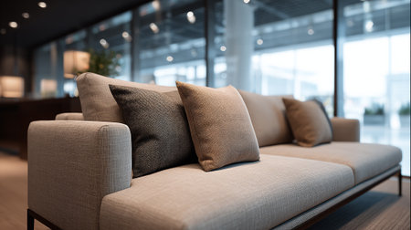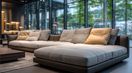 A modern beige sofa with brown pillows in a stylish living room setting with large windows