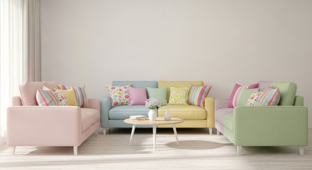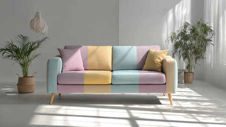 This image features a modern pastel sofa placed in a bright interior setting. Sunlight filters through large windows, creating a warm atmosphere. The sofa is complemented by decorative cushions and a potted plant, adding charm and lifestyle appeal to any living space.