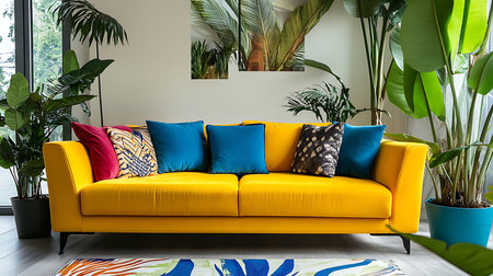 A stunning living room showcasing a yellow sofa surrounded by lush indoor plants.
