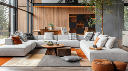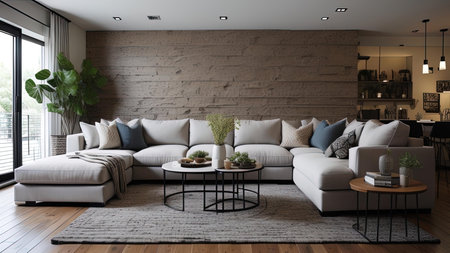 Contemporary living room with modular furniture arranged for conversation, featuring corner couch and balanced accessories