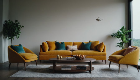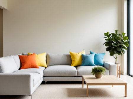 AI Generated. Modern Living Room Interior Design with Colorful Pillows and a Plant