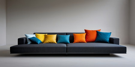 AI Generated. black and gray sofa with colorful cushions