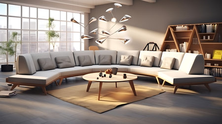 Modern living room interior design with sofa, bookshelf and plants