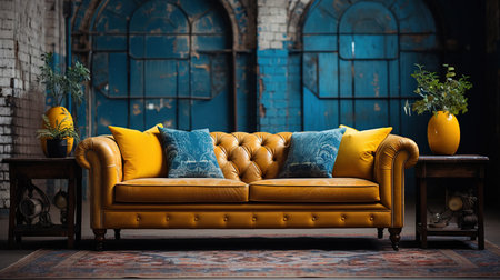 Yellow Suede Couch Placed Infront of Old Peeled Brick Blue Wall Background Image