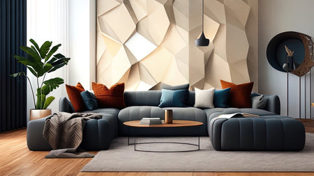 AI Generated. Modern living room with a stylish sofa adorned with colorful pillows and abstract art