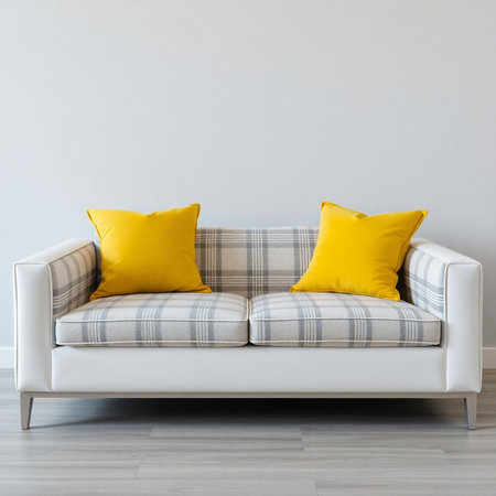 interior of a modern living room with sofa and yellow pillows