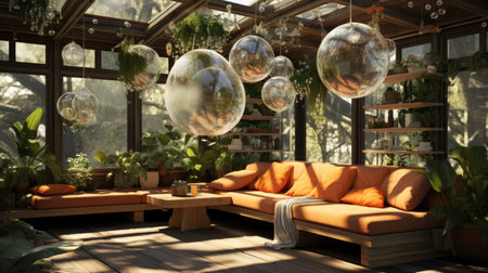 Interior of modern living room with orange sofa and transparent bubbles