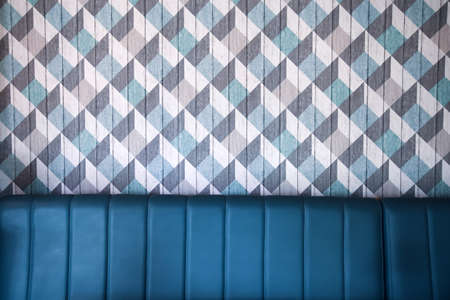 Close up on a modern restaurant interior with turquoise sofa and abstract wall