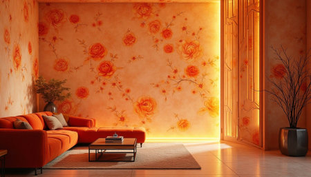 A modern living room with a geometric patterned accent wall and a comfortable sectional sofa