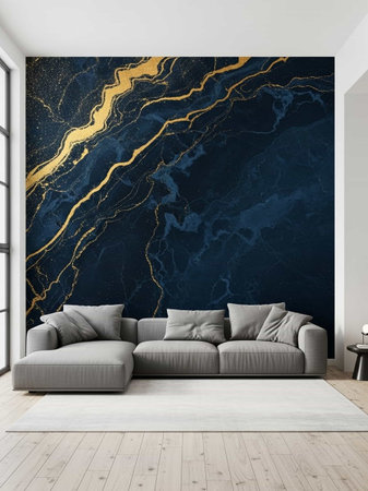 Contemporary stylish room with gray couch, blue abstract artwork, coffee table, square molding and decorative pillows