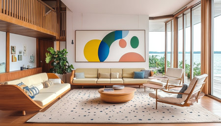 A stylish modern living room featuring colorful artwork, elegant furniture, and vibrant decor, creating a cozy and inviting atmosphere for relaxation.