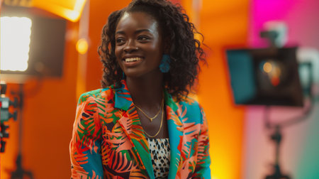 Beautiful african american woman with afro hairstyle in colorful jacket.