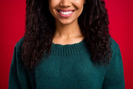 Photo of adorable shiny dark skin woman neck dressed green pullover smiling isolated red color background