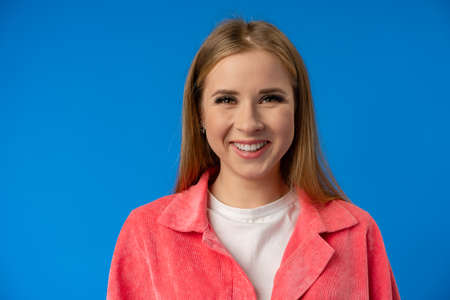 Portrait of young smiling european woman. Beautiful happy blonde girl wears t-shirt and looks at camera. Studio shoot isolated on blue background.