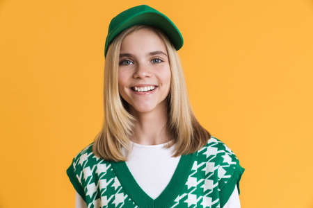 White girl wearing vest smiling and looking at camera isolated over yellow background