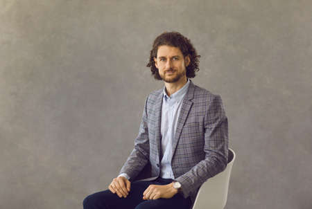 Portrait of a serious caucasian executive businessman sitting on a chair on a gray background. Handsome man dressed in stylish business clothes looks straight into the camera. Confidence and success.