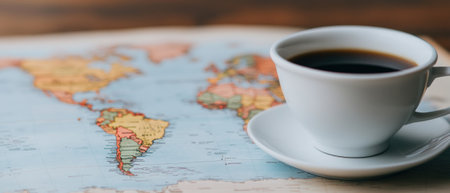 A cup of coffee placed on a world map, symbolizing travel and exploration.
